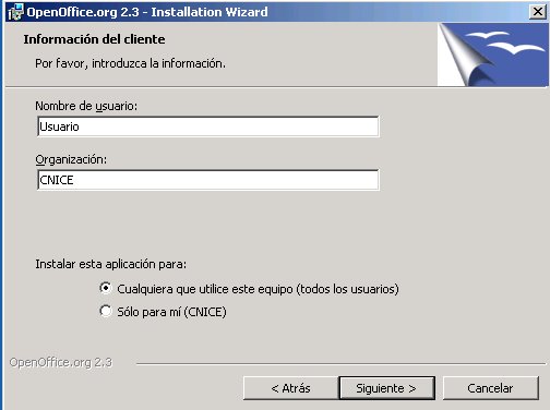 En el siguiente paso puedes especificar tu nombre y el del Centro si quieres que el programa los utilice automáticamente. Según el tipo de instalación que estés haciendo podrás decidir si ese nombre es para utilizarlo en tu perfil exclusivamente o para cualquier usuario el equipo.