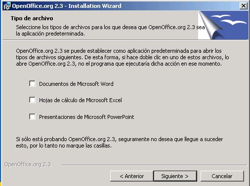 El programa ofrece la posibilidad de convertirse en el gestor por defecto de los documentos de MS Office. Si no tienes instalada la suite de Microsoft puedes marcar todas las casillas y podrás manejar los archivos creados con ella utilizando OpenOffice. Sin embargo, si lo tienes instalado tal vez sea conveniente que mantengas las casillas desmarcadas para permitir que cada suite maneje sus archivos.