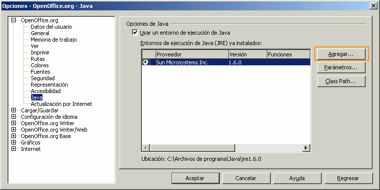 Es importante instalar Java para que el programa cuente con todas sus funcionalidades, por lo que hemos recomendado optar por el instalador que incluye este entorno de ejecución. Para comprobarlo puedes acudir a la opción de menú Herramientas / Opciones y elegir la sección Java del bloque OpenOffice.org