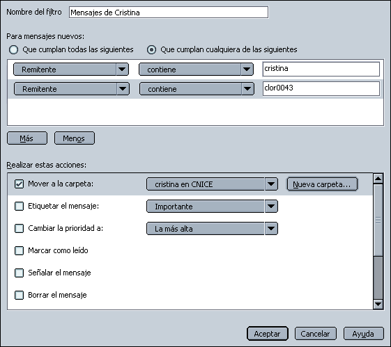 Crea un filtro que envíe los mensajes que recibas de alguno de tus corresponsales a una carpeta especial que crees al efecto.