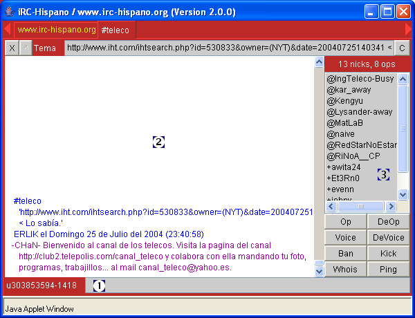 La otra opción que tenemos es acceder a un chat desde una página web. El único requisito será seleccionar un apodo y pulsar el enlace correspondiente. Hay chats basados en html, pero la mayoría de ellos utilizan aplicaciones basadas en Java, lo cual hace que tengamos que esperar un cierto tiempo la primera vez que accedemos, necesario para que se descargue y se compile en nuestra máquina la aplicación. Obviamente nuestro navegador deberá tener habilitada la ejecución de Java, que estará disponible salvo que hayas configurado la seguridad en el nivel más alto.