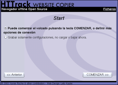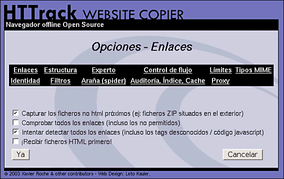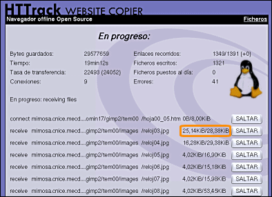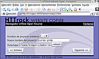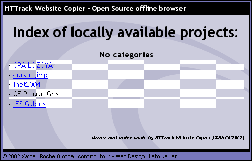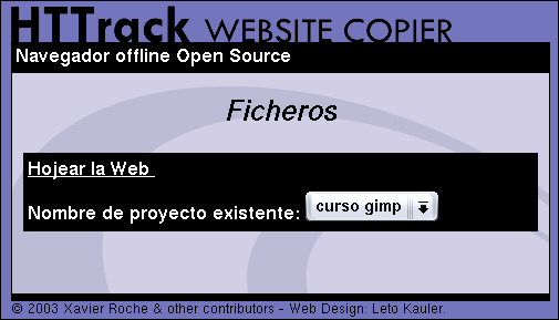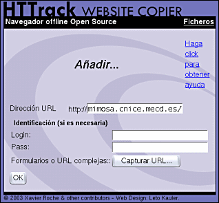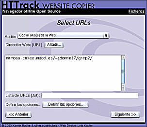 Entre las múltiples utilidades que pueden encontrarse hemos optado por HTTrack del cual puedes encontrar la versión 3.32-2 de mayo de 2004 tienes en la carpeta de programas. Si quieres consultar la disponibilidad de alguna versión más reciente puedes hacerlo en la página www.httrack.com. Se trata de un programa de código abierto disponible para plataformas Linux, donde recibe el nombre de WebHTTrack y Windows, versión que se denomina WinHTTrack.