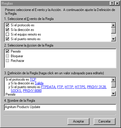 En estos casos, cuando se lance el asistente ya vendrán recogidos los datos que caracterizan la situación: protocolo, dirección de la comunicación, URL del equipo remoto, puerto, etc, debiendo especificar la acción que deseamos que se realice. En la imagen que se muestra como ejemplo vemos las condiciones y la acción que se aplica para la configuración de las actualizaciones del propio cortafuegos.