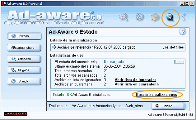 La ejecución del programa es muy intuitiva. Lo primero que deberías hacer cada vez que vayas a utilizarlo sería actualizar el archivo que contiene las referencias de los programas y sitios espías, para lo cual puedes utilizar cualquiera de las dos opciones que aparecen marcadas en la imagen.