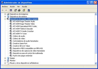 Comprueba que la tarjeta de sonido está correctamente instalada, para ello sigue el esquema Inicio/ Configuración/ Panel de control/ Rendimiento y mantenimiento/ Sistema / Hardware / Administrador de dispositivos, marca sobre dispositivos de Sonido, vídeo y juegos, tal como se te muestra en la figura: