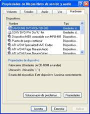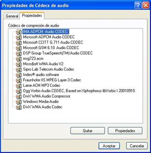 En la pestaña Hardware y en Códecs de audio pestaña Propiedades se muestra la colección de códecs disponibles en el equipo, es posible que algunos archivos necesiten ciertos códecs que no disponibles, éstos se pueden bajar de Internet a través de páginas especializadas.