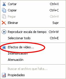 Los Filtros de vídeo son muy variados y se pueden emplear en cualquier punto de las escenas del vídeo. En Movie maker se pueden obtener pulsando el botón derecho en cualquier punto de un clip de vídeo dentro de la línea de tiempos: