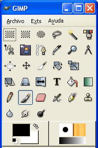 La paleta de herramientas de GIMP está dividida en cuatro partes: los menús, las herramientas, los colores de frente y fondo, y una última parte que muestra la brocha, el patrón y el gradiente activo.