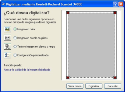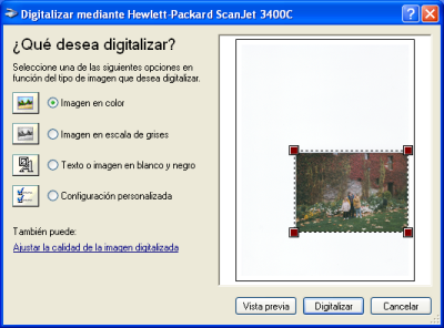 Se ejecutará un previsualizado de la imagen como el mostrado a continuación y se elige la región de la pantalla que contiene la fotografía. Además aquí se puede proceder a realizar diversos ajustes en Ajustar la calidad de la imagen digitalizada, que permite: