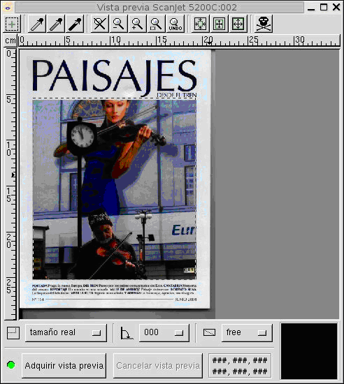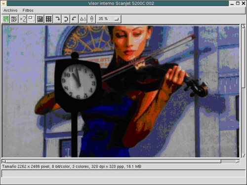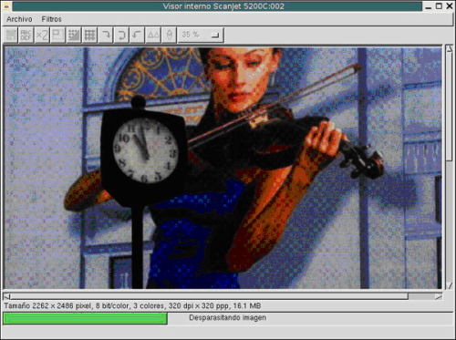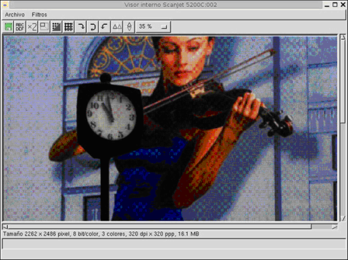 8. Ve a la ventana principal y pulsa sobre el botón Escanear. Se inicia la digitalización nuevamente de la zona seleccionada y aparece la ventana de visualización de la imagen ya digitalizada, debido al tipo de papel en el que está impresa la imagen, el resultado es mejorable.
