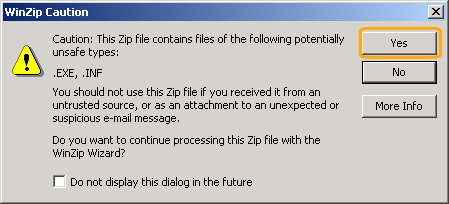 Al haber detectado la existencia de archivos ejecutables esta versión de Winzip nos avisa de que puede ser peligroso, pero dado que se trata de un archivo fiable aceptamos.