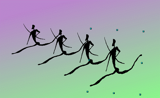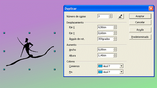 En algunos casos puede interesar que cada copia tenga un color diferente, para conseguirlo sólo tenemos que señalar el color del comienzo y el color del fin. Como se puede comprobar en la figura 2.6, el color del comienzo es el Amarillo y el del final Rojo 2. Draw ha creado los naranjas intermedios.