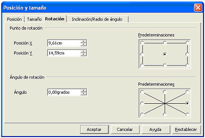 En el campo Predeterminaciones se puede señalar la situación del punto de rotación respecto al objeto. El punto seleccionado aparece en negro.