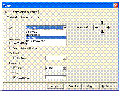 Al pulsar en la flecha aparece un listado con los efectos que se pueden seleccionar: Sin efecto, Intermitente, Continuo, De un lado al otro, Entrar.