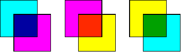 Los colores secundarios de la mezcla aditiva son los básicos o primarios en la mezcla sustractiva. Cian, Magenta y Amarillo y su mezcla, dos a dos, dan lo secundarios: azul violáceo, rojo anaranjado y verde.
