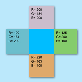 En el ejemplo siguiente se han dibujado unos cuadrados de 4 cm de lado, el del centro se ha rellenado con el color de la paleta Azul 7, los de alrededor se han rellenado con modificaciones, en todos se ha puesto algo de los tres primarios.