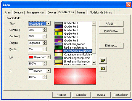 Desde el cuadro de diálogo Área abrir la ficha Gradientes o en la Barra de Menús seleccionamos Formato > Relleno se abrirá el cuadro de diálogo Área, que ya conocemos, presionamos sobre la ficha Gradiente y aparecerá el siguiente cuadro de diálogo.