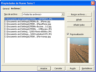 Si se quiere añadir una imagen en uno de los temas existentes, abrimos su menú contextual y pulsamos sobre Propiedades. Aparecerá el cuadro de diálogo Archivos.