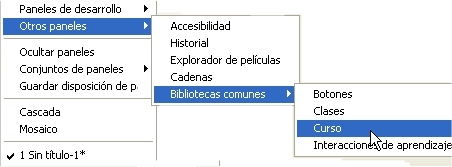 Nota: La biblioteca común Curso es simplemente un archivo FLA que ha sido creado para reutilizar sus símbolos en los ejercicios que se proponen en este curso. Es accesible desde Ventana > Otros paneles > Bibliotecas comunes porque previamente ha sido copiado a la carpeta Libraries dentro del directorio en el cual está instalada la aplicación Flash. |