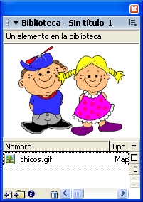 Cuando se importa un mapa de bits (archivos bmp, gif, jpeg, etc) a un documento Flash, éste aparece en la Biblioteca precedida del icono correspondiente a un mapa de bits. |