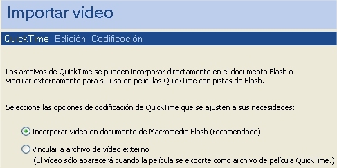En el cuadro de diálogo Importar video, selecciona Incorporar video en documento de Macromedia Flash (recomendado) y clic en el botón Siguiente
