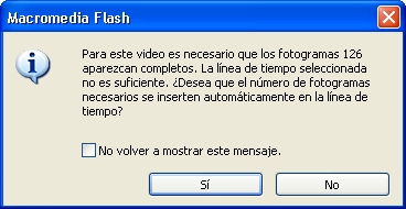 Para situar el clip de video en el escenario, selecciona la herramienta Flecha y arrastra este elemento desde la Biblioteca hasta el lienzo. Flash mostrará un mensaje de advertencia si el clip tiene más fotogramas que la línea de tiempo de la película donde se quiere insertar. Clic en Sí para añadir los fotogramas necesarios en la línea de tiempo actual. |