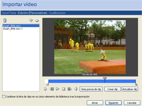 | 9 | Activa la casilla Combinar la lista de clips en un único elemento de biblioteca tras la importación. De esta forma en la Biblioteca del documento actual se creará un sólo clip de película que contendrá la secuencia de videos en el orden establecido. Si esta celda no está activada, se producirán tantos clips de video en la Biblioteca como fragmentos hemos creado. | |||||