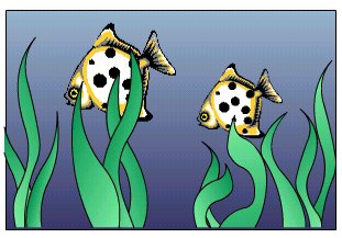 Desde la biblioteca común Curso, arrastra al escenario varias instancias del símbolo pez. Estas instancias se sitúan en esta capa. Puedes jugar con el tamaño de los peces usando la herramienta Transformación libre. |