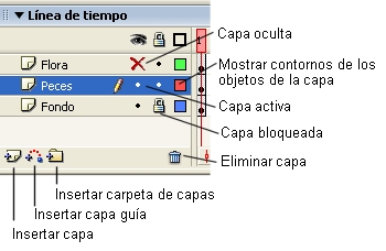 Nota: Las capas se pueden ocultar o mostrar para facilitar el diseño de la película pero cuando se ejecuta la reproducción de la misma, se visualizarán todas las capas de la línea de tiempo. |