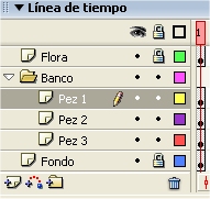 Doble clic sobre el nombre de esta nueva carpeta para cambiárselo: Banco. Advierte que las capas Pez 1, Pez 2 y Pez 3 no están dentro de esta carpeta. |