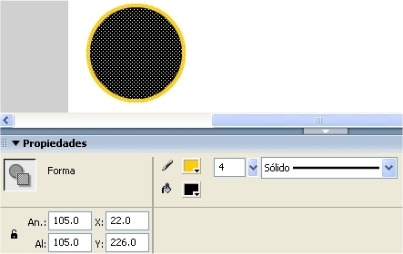 Doble clic sobre el círculo para seleccionar su trazo y su relleno. En el Inspector de propiedades define los siguientes parámetros: An (anchura) 100 y de Al (altura) 100 y situado en la posición X e Y (200,200) del escenario. |