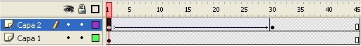 Clic derecho en el fotograma nº 45 de Capa 2 y selecciona Insertar Fotograma .No es necesario añadir un fotograma clave porque del 30 al 45 su contenido no varía. Este espacio se muestra en la línea de tiempo sobre fondo gris claro con un punto negro en el extremo izquierdo y un rectángulo hueco en el derecho. |