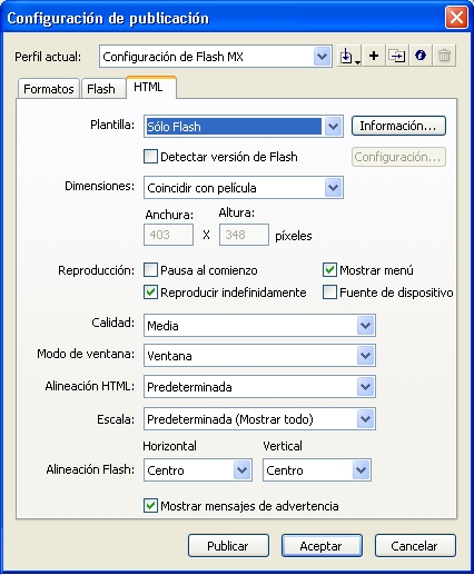 Solapa de configuración del archivo HTML que muestra el SWF en el navegador |