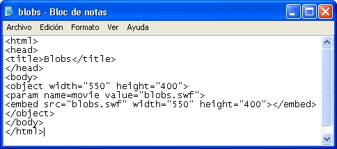 | 4 | Teclea como nombre blobs.htm y guarda este documento HTML en la carpeta Juegos situada en el directorio Curso Flash. Aquí se encuentra precisamente el archivo Flash blobs.swf. Como en las etiquetas no hemos incluido ruta a la animación Flash, ambos archivos, HTML y SWF, deben grabarse en la misma carpeta. | ||||