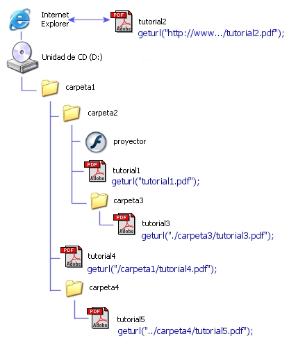 Sin ruta: Si no se especifica, Flash toma por defecto la misma carpeta donde se encuentra grabado el proyector. Ejemplo: geturl(“tutorial1.pdf”); |