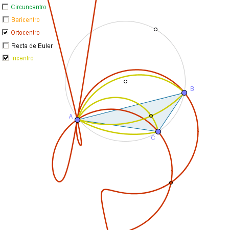 Realizar una construcción similar, algo menos general, con dos vértices del triángulo sobre la circunferencia. Ahora, para cada punto notable, se deberán crear dos lugares geométricos (según gire sobre la circunferencia un vértice u otro):
