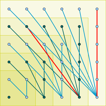 Sin embargo, no hemos tenido en cuenta que algunas diagonales pueden coincidir con tramos verticales u horizontales. En particular, resulta que los segmentos mostrados en rojo en la siguiente imagen tienen la misma longitud: