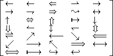 | \left [ \array{ \leftarrow & \gets & \Leftarrow & \rightharpoonup & \rightarrow \\ \to & \rightharpoondown & \Rightarrow & \leadsto & \leftrightarrow \\ \uparrow & \Leftrightarrow & \Uparrow & \mapsto & \downarrow \\ \Downarrow & \leftharpoonup & \updownarrow & \leftharpoondown & \Updownarrow \\ \rightleftharpoons & \nearrow & \longleftarrow & \searrow & \Longleftarrow \\ \swarrow & \longrightarrow & \nwarrow & \Longrightarrow & \longleftrightarrow \\ \Longleftrightarrow & \longmapsto & \hookrightarrow & \hookleftarrow } \right ] |
