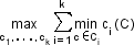 | \max_{c_1,\ldots,c_k} \, \sum_{i=1}^k \min_{c\in C_i} \, c_i \, (C) |