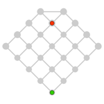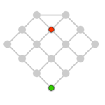 Reglas del juego: Cada jugador mueve por turno a una casilla adyacente, siguiendo las líneas. El primer jugador en mover es el de la ficha roja. El primer jugador tiene por objetivo tratar de caer en la casilla en donde se halle el segundo jugador, quien debe tratar de huir. El que consiga su objetivo, gana (el primer jugador dispone de cinco minutos para alcanzar su objetivo: en caso contrario, pierde). Si ambos jugadores son expertos, el primer jugador, con la ficha roja, puede ganar siempre. ¿Cómo?