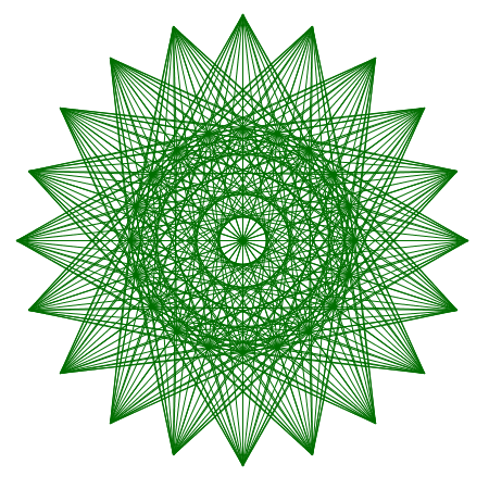 Realizar una construcción similar que una todos los vértices de dos polígonos regulares de n vértices situados en circunferencias concéntricas de radios en proporción 2:1. Para n=20, la figura resultante será similar a la siguiente: