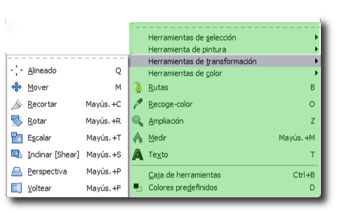 Elegimos en el menú contextual Herramientas --> Herramientas de transformación o en la barra de Menús, Herramientas --> Herramientas de transformación.