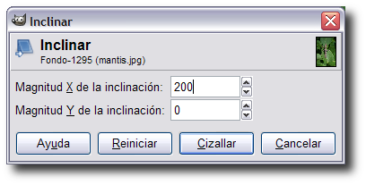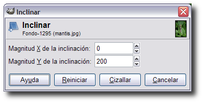 Nos permite inclinar una capa, selección o ruta. Si la magnitud de la escala en el eje X es positiva la inclinación se realiza hacia la parte izquierda de la imagen y si es negativa se hace hacia la parte derecha, siempre que utilicemos la opción Directa (tradicional) de Dirección de la transformación. También podemos hacer una inclinación en el eje Y si movemos el ratón hacia arriba o hacia abajo.