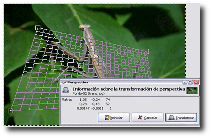 Transforma la selección, capa o ruta de acuerdo a la perspectiva elegida de forma interactiva en la Ventana imagen. Al hacer clic con el ratón en la Ventana imagen aparece la rejilla que simula el tamaño final de la transformación: podemos mover cada uno de los cuatro vértices de esa rejilla para obtener una perspectiva. Para aplicar la transformación debemos hacer clic en el botón Transformar del cuadro de diálogo que aparece.