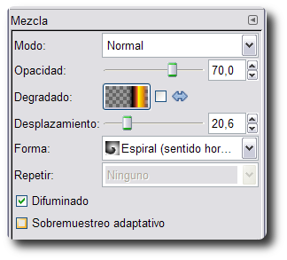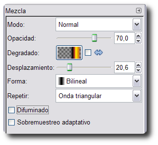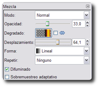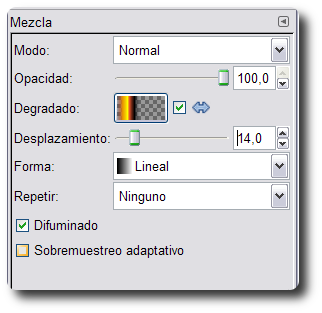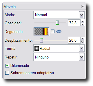 Podemos seleccionar nivel de opacidad, modo de combinación, inversión del degradado así como la opción de Deslizar, que permite comprimir el degradado en un espacio más pequeño de la zona de la imagen elegida.