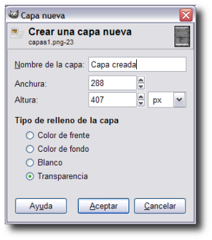 En este caso el nombre de la capa es "Capa cread", con un tamaño de 288 x 407 píxeles y el relleno es Transparente. Una vez que hacemos clic en Aceptar,