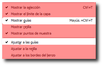 Desaparecerá la atracción de las guías y podremos utilizarlas solamente como referencia. También podemos hacer que desaparezcan momentáneamente las líneas guía haciendo clic en Ver --> Mostrar guías. Este cambio sólo afecta a la Ventana Imagen activa. Cuando necesitemos de nuevo las guías volvemos a seleccionar esta opción y aparecerán en el lugar en el que estaban.