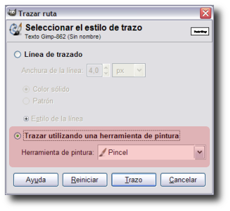 Selecciona "Trazar utilizando una herramienta de pintura" y elege la opción Pincel para que el trazo se realice con el pincel seleccionado en la Caja de herramientas. Haz clic en el botón Trazo. Observa