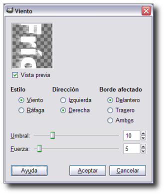 Filtros --> Distorsiones --> Viento. Aparece la siguiente ventana en la que modificaremos los parámetros
