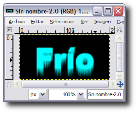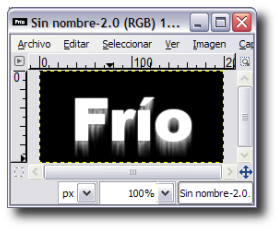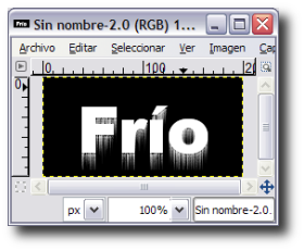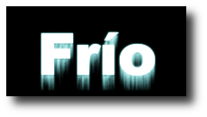 - Crea una nueva imagen con un tamaño 200x100 píxeles y fondo negro. En una nueva capa de texto escribe "Frío" en "Arial Black" con un tamaño de 64 puntos y color blanco. Sitúa esa capa en el centro de la imagen y la renombras como "Frío". Redimensiona esta capa utilizando la opción Capa a tamaño imagen haciendo clic con el botón derecho sobre el icono de la capa en la Ventana Capas. Haz una copia de la capa "Frío" y llámala "Copia frio".